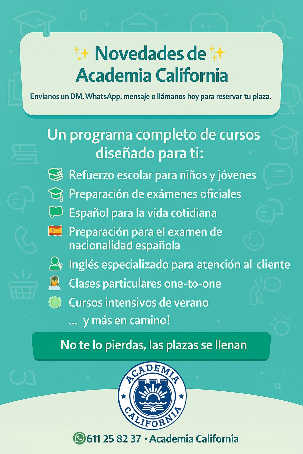 En Academia California te ofrecemos clases prácticas y dinámicas, pensadas para que puedas manejarte en situaciones reales —desde hacer la compra hasta hablar con tus vecinos— desde el primer día.