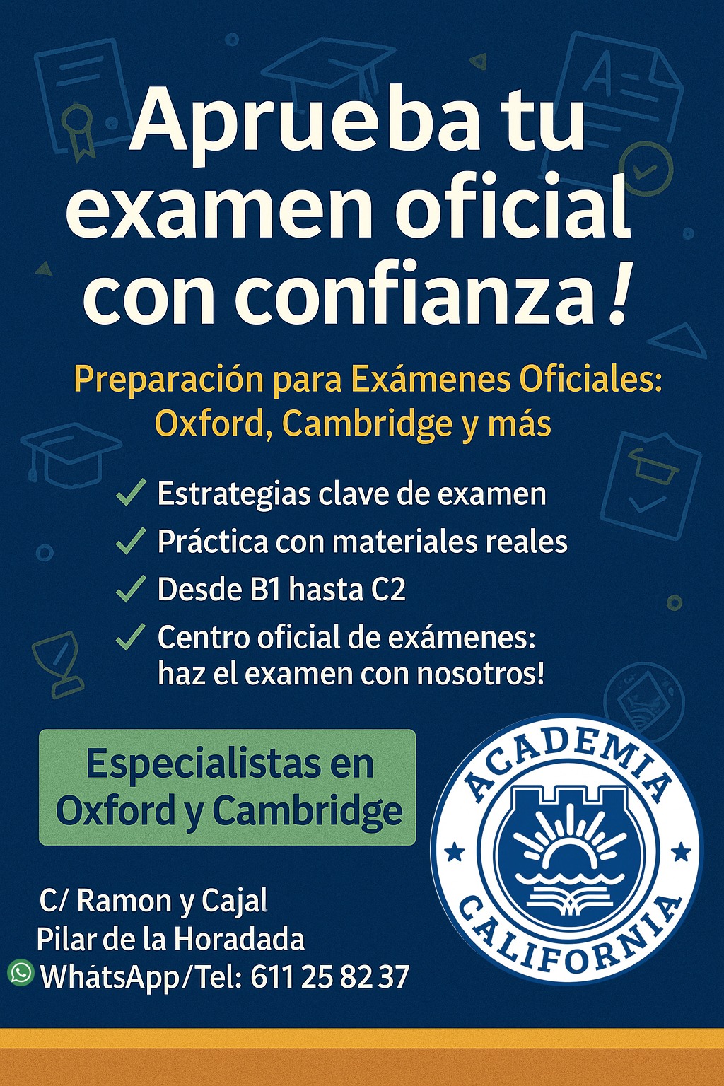 En Academia California llevamos más de 30 años ayudando a estudiantes a alcanzar sus objetivos lingüísticos y obtener certificaciones oficiales de inglés reconocidas a nivel internacional. Si tu meta es conseguir un título que abra puertas académicas o profesionales, somos especialistas en preparación de exámenes oficiales.