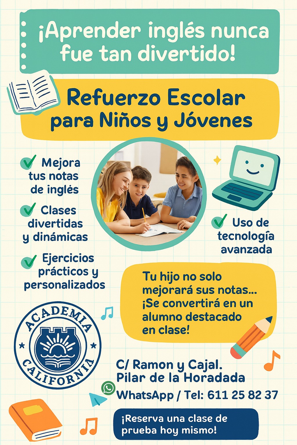 En Academia California llevamos más de 30 años ayudando a estudiantes de todas las edades a mejorar sus habilidades en inglés y convertirse en los alumnos más avanzados de su clase. Nuestro compromiso es que cada niño o joven no solo mejore sus notas, sino que también gane seguridad, motivación y gusto por aprender un idioma.