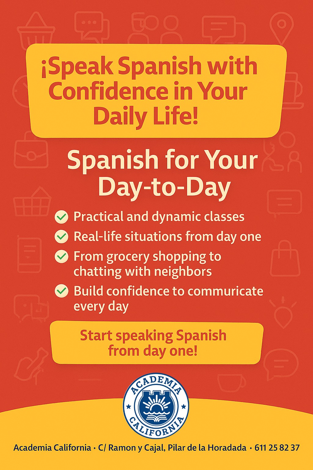 ¿Quieres comunicarte con seguridad en tu día a día en España? En Academia California ofrecemos clases de español práctico, diseñadas para que puedas desenvolverte en situaciones reales y cotidianas, desde tu primer día.